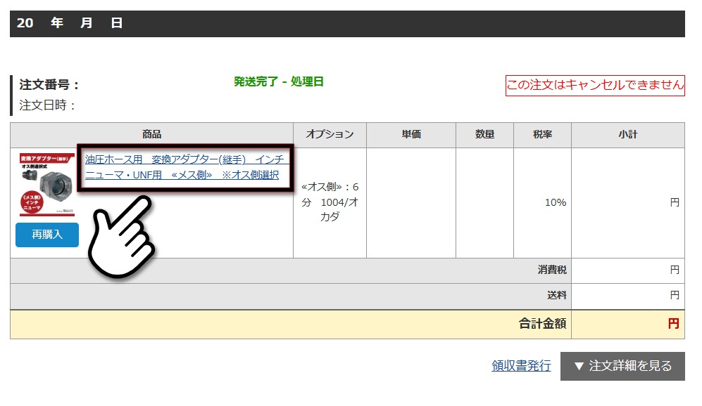 ②注文履歴のページ内の、「商品」を開きます。